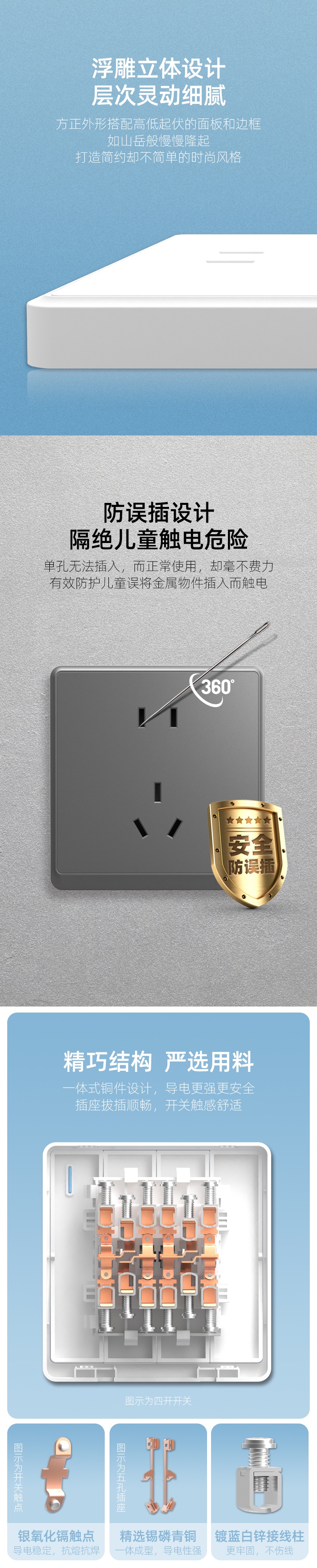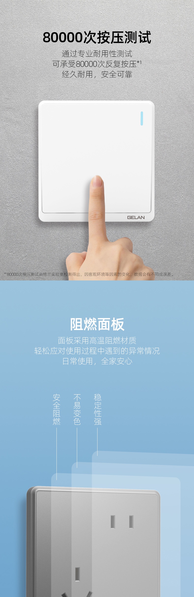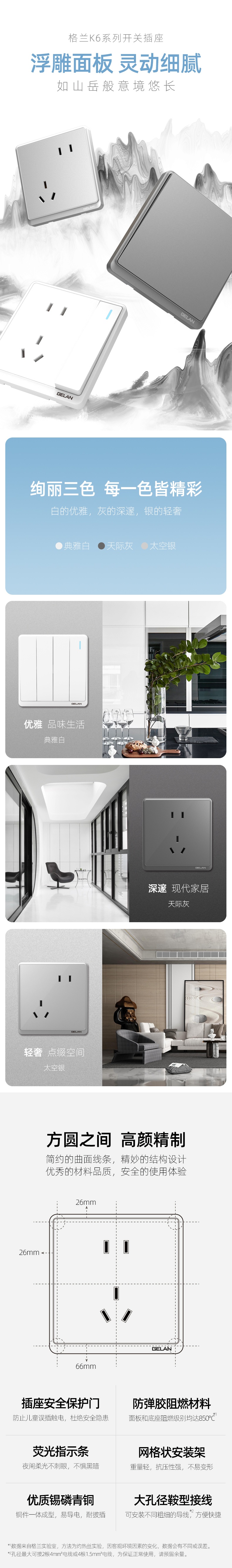 GELAN格蘭電氣K6系列開關(guān)插座,有的不止是美感,還有品質(zhì)。極簡(jiǎn)設(shè)計(jì)風(fēng)格,安全舒適體驗(yàn),符合當(dāng)下裝修審美,簡(jiǎn)約而不簡(jiǎn)單,在細(xì)節(jié)支出盡顯GELAN品牌匠心,賦予生活品質(zhì)內(nèi)涵的同時(shí),呵護(hù)著千家萬(wàn)戶的用電安全。